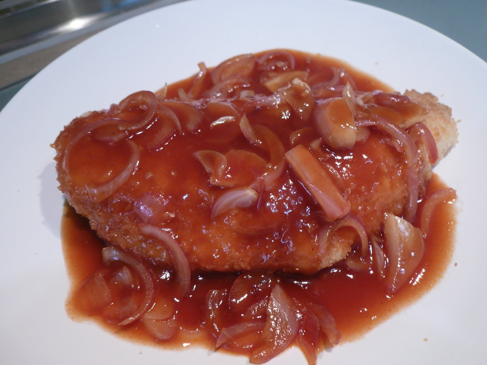 2)把锅洗好后,放点油爆香onion, 后放下番茄酱和水, 煮沸后淋上炸好的鱼片